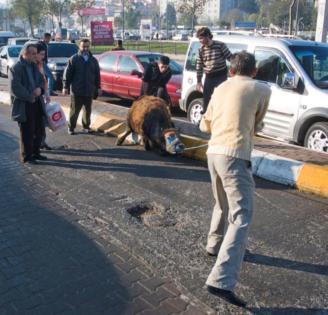Een paar dagen geleden vond in Istanbul evenals in veel andere islamitische steden, het jaarlijkse offerfeest plaats. Daarbij ging het er weinig zachtzinnig aan toe. Een dier zou met het doorsnijden van de halsslagader net zo snel aan zijn einde komen als bijvoorbeeld door een fikse stroomstoot. Dat vertellen niet alleen moslims, want aangezien de halal regels veel weg hebben van de joodse spijswetten, beweren religieuze joden hetzelfde. En die hebben volgens menigeen op deze aardkloot doorgaans het gelijk aan hun kant, dus zullen we hier maar geen discussie over ritueel slachten beginnen. Het blijft echter een weinig verheffend tafereel om te zien hoe een koe door pa wordt voortgesleurd, terwijl zoonlief het arme dier hard met een stok op zijn achterste ramt om hem tot voortgang te manen. Helemaal als het doodsbenauwde beest daarbij ook nog eens door zijn poten zakt. Zonder meer mensonterend. Daar is het gemeentebestuur in Istanbul zich ook goed van bewust. Voor een deel uit menselijke gevoelens, maar ook omdat zoiets natuurlijk spekkie voor het bekkie is van bijvoorbeeld de blonde plaag uit Venlo. Daarom stelt men containers ter beschikking, waar de koe levend in gaat en er aan de andere kant keurig in plakjes gesneden weer uitkomt. Kost een habbekrats, maar veel Istanbulianen hebben dat (er) niet (voor over). Dus slepen ze de koe met veel gedoe naar een nabij gelegen grasveldje en gaan er met de hele familie bovenop zitten, waarna pa het mes ter hand neemt. Nu kun je wel zeggen dat schapen en runderen er langs evolutionaire weg, dan wel via het Opperwezen zijn gekomen omdat ze zoveel geconcentreerde energie bieden en omdat ze zo lekker zijn, maar dit is zelfs voor de meest verstokte vleeseter geen schouwspel om blij van te worden. Evenmin erg hygienisch. Edoch, het zal de harde kern binnen de aanhang van de Partij voor de dieren plezier doen dat het dierenrijk wraak nam. En hoe. Want gedurende het offerfeest raakten 200 Turken gewond door om zich heen schoppende koeien, terwijl een nog groter aantal ten gevolge van de varkensgriep kwam te overlijden.